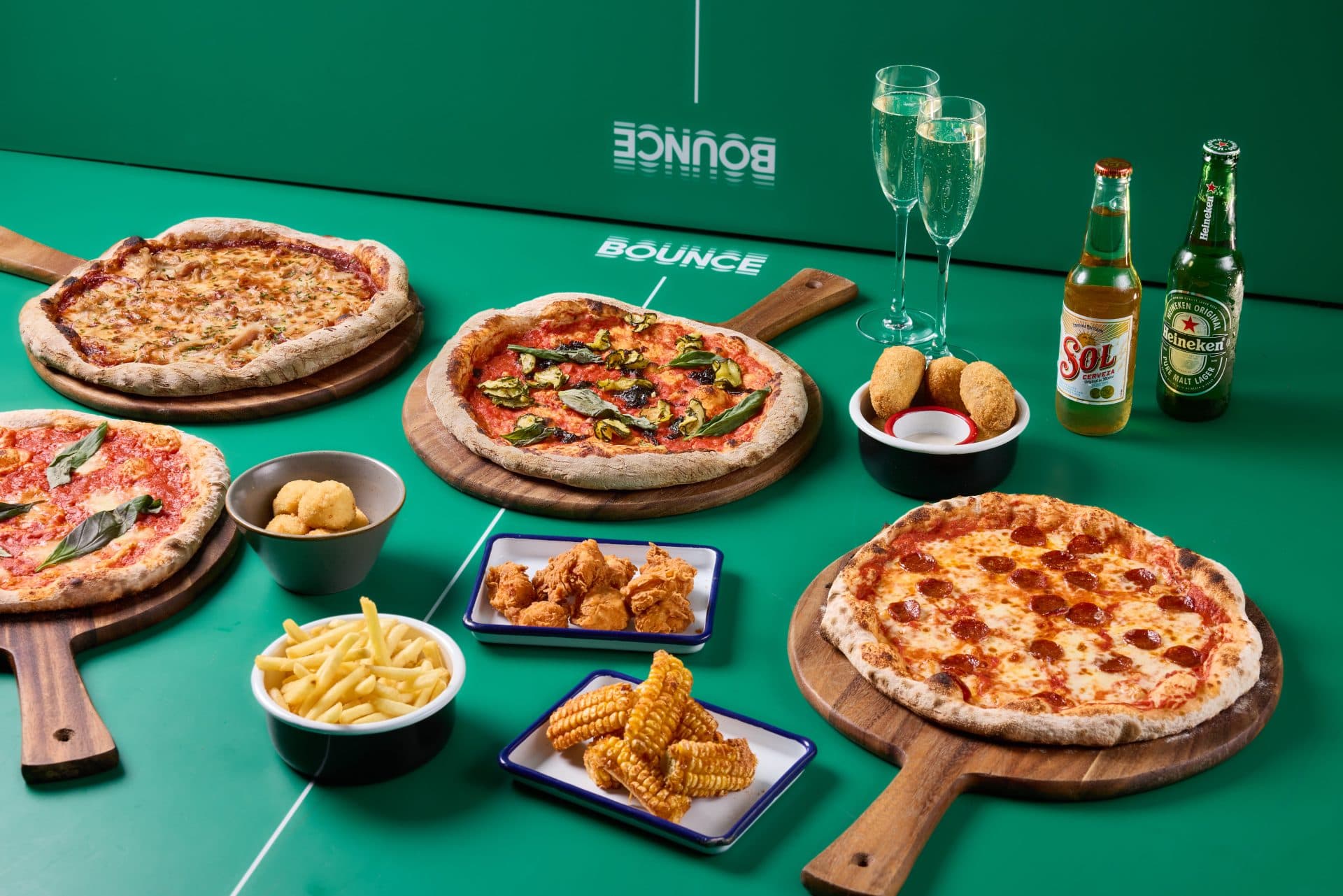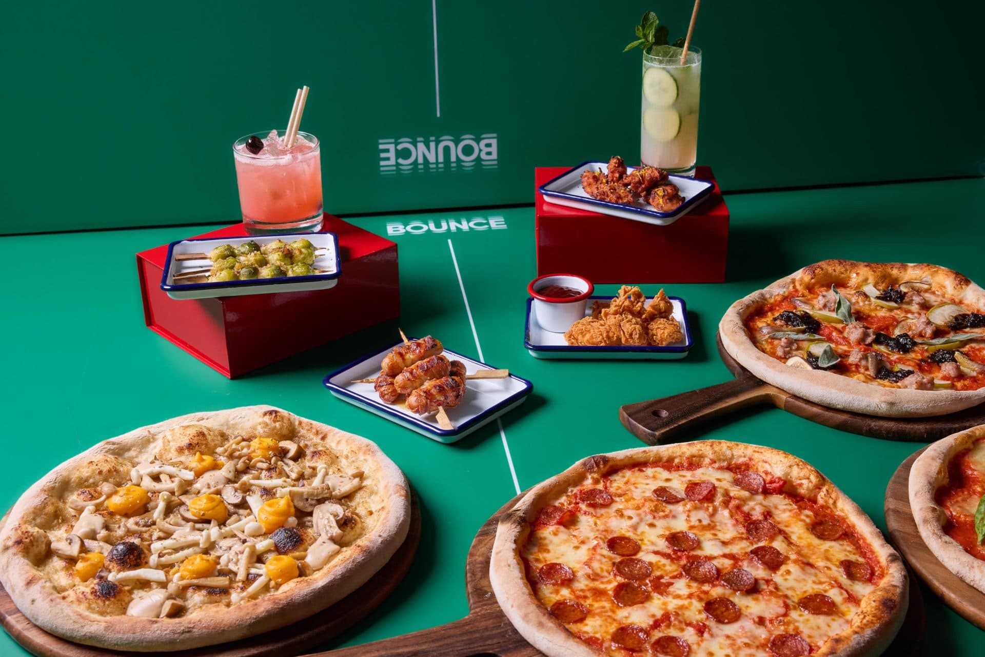 From popcorn chicken with cranberry & gochujang to miso-maple pigs in blankets, sprout skewers with chestnut crumb and crowd-pleasing pizzas (think pepperoni, pork & apple or mushroom & chestnut), our festive menu does the heavy lifting so you can play. Packages include beer, Prosecco and wine, with cocktails and mocktails available to buy in-venue. Drinks-only option skips food.